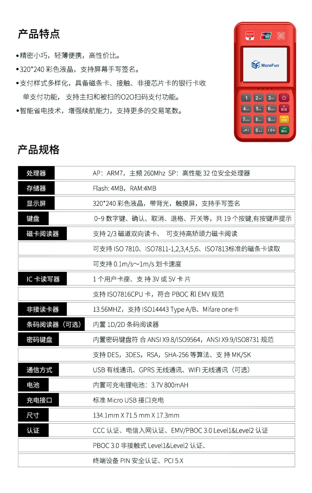 首页>>丰台产品中心>>丰台手持无线POS 丰台联动优势-优POS Pro 高配版 * 性能优越:32位高性能ARM11安全CPU;整机通过业内更先进的PCI PED4.X 安全认证及国内受理终端PIN输入设备安全评估检测认证,多项措施保障金融交易的安全;* 时尚外观:外形小巧携带方便,高抗跌落性能、宽工作温度、防水防尘设计、外壳坚固耐刮、户外携带式作业更加耐久可靠。* 通讯备份:支持2G-3G扩展;* 超长续航:3.7V-800毫安稳定续航能力,智能电池管理保证持续工作18小时,待机72小时。 标准配置 返 回